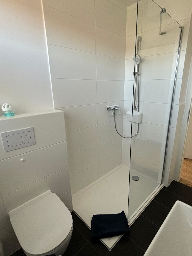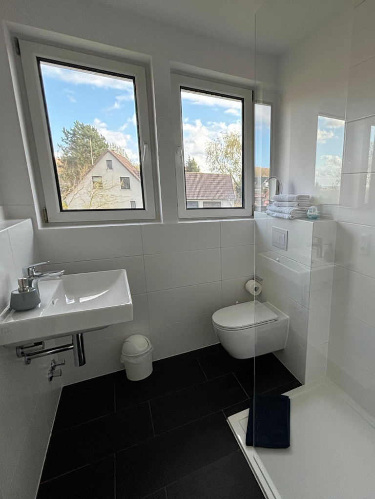 - Badezimmer mit Fenster und ebenerdiger Dusche
